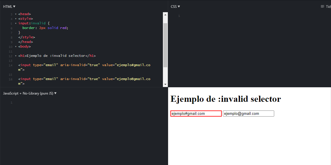 En un formulario, en el nos exige escribir una dirección de correo electrónico, usamos el atributo “invalid” cuando no se cumpla la condición, en este caso, que no se escribe la arroba.