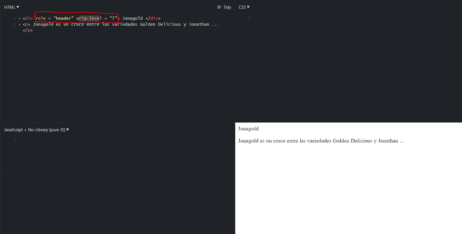 Esta técnica proporciona una forma para que las tecnologías de asistencia (AT) identifiquen un contenido como encabezado. Aplicar role = "header" a un elemento hace que un AT (como un lector de pantalla) lo trate como si fuera un encabezado.